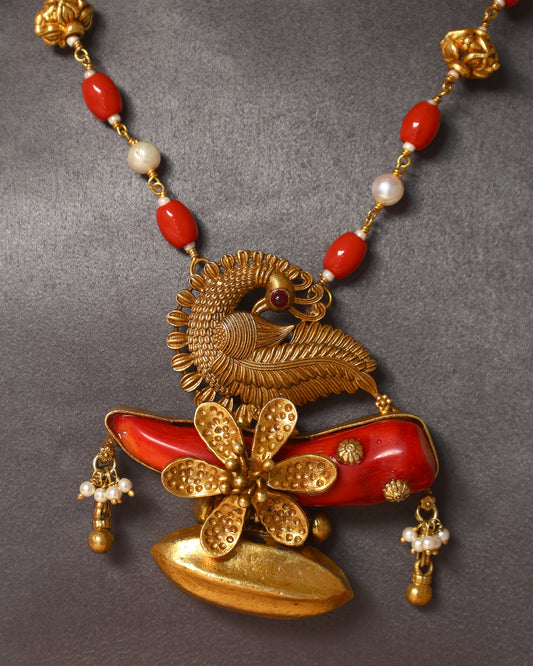 Handcrafted Necklace in 92.5 Silver with Coral, Pearls